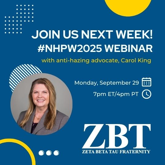 National Hazing Prevention Week (NHPW), sponsored by Hazing Prevention Network, is your chance to step up, speak out, and make a difference on campus. Zeta Beta Tau is a Bronze Member of Hazing Prevention Network. Held the last full week of September, NHPW brings students together to raise awareness and take action against hazing. This year’s theme, “Be the leader. Prevent hazing.” highlights how you can create safer, stronger communities through education, advocacy, and awareness.
