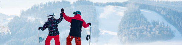 August 28, 2025 Shot of a couple high fiving each other posing on top of a snowy mountain observing stunning winter view resting after snowboarding extreme people romantic friendship trip getaway Posted in: