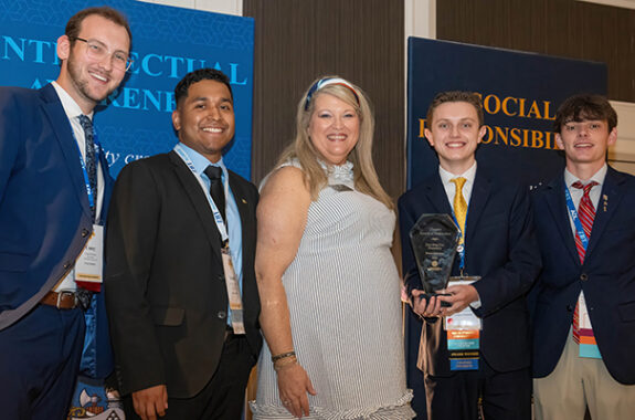 Read More >Pictured: Delta Lambda brothers accepting the NIC Award during the presentation at 2025...